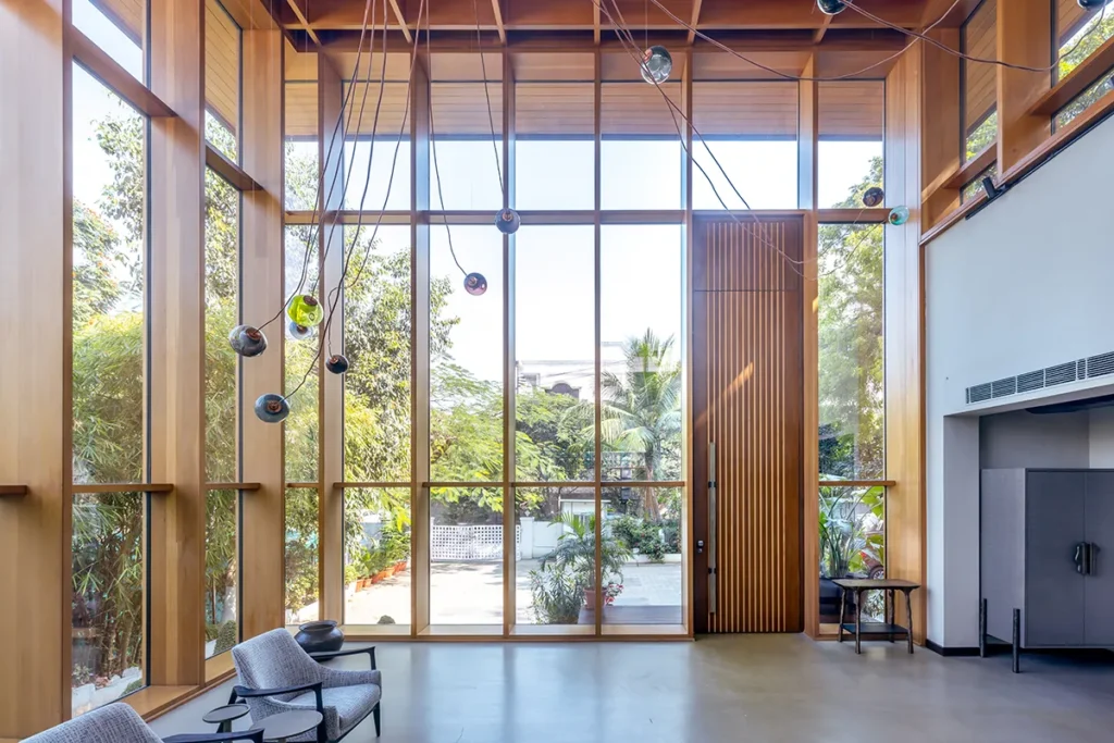 Among the early adopters was Artius, an established Indian wood manufacturer of high‑end door and window systems. Building on its expertise, Artius expanded into engineered wood and structural applications, including the manufacturing and use of structural glulam, using Douglas‑fir from British Columbia. Through FII‑supported workshops, technical training, and exposure to mass timber demonstration projects in British Columbia, the company transitioned into the use of structural glulam. Over time, Artius has completed a growing portfolio of custom glulam residences, experience centres, and commercial projects in India, helping normalize the use of structural mass timber in the market.